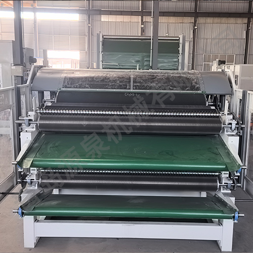該機(jī)采用雙錫林梳理,雙道夫,雙雜亂出棉,雙羅拉剝棉,具有分梳能力強(qiáng),梳理精度高等優(yōu)點(diǎn)。喂入羅拉分上下兩組配對,變頻調(diào)速,并裝有金屬探測裝置,具有自停報(bào)警功能。且自動送入鋪網(wǎng)機(jī)斜簾,減輕操作工的勞動強(qiáng)度。